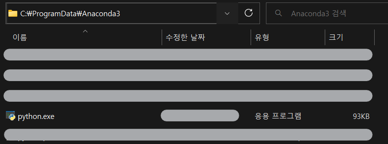 ๋๋ ์๋์ ๊ฐ์ด C:\ProgramData\Anaconda3๊ฒฝ๋ก์ python.exeํ์ผ์ด ์กด์ฌํ๋ค.